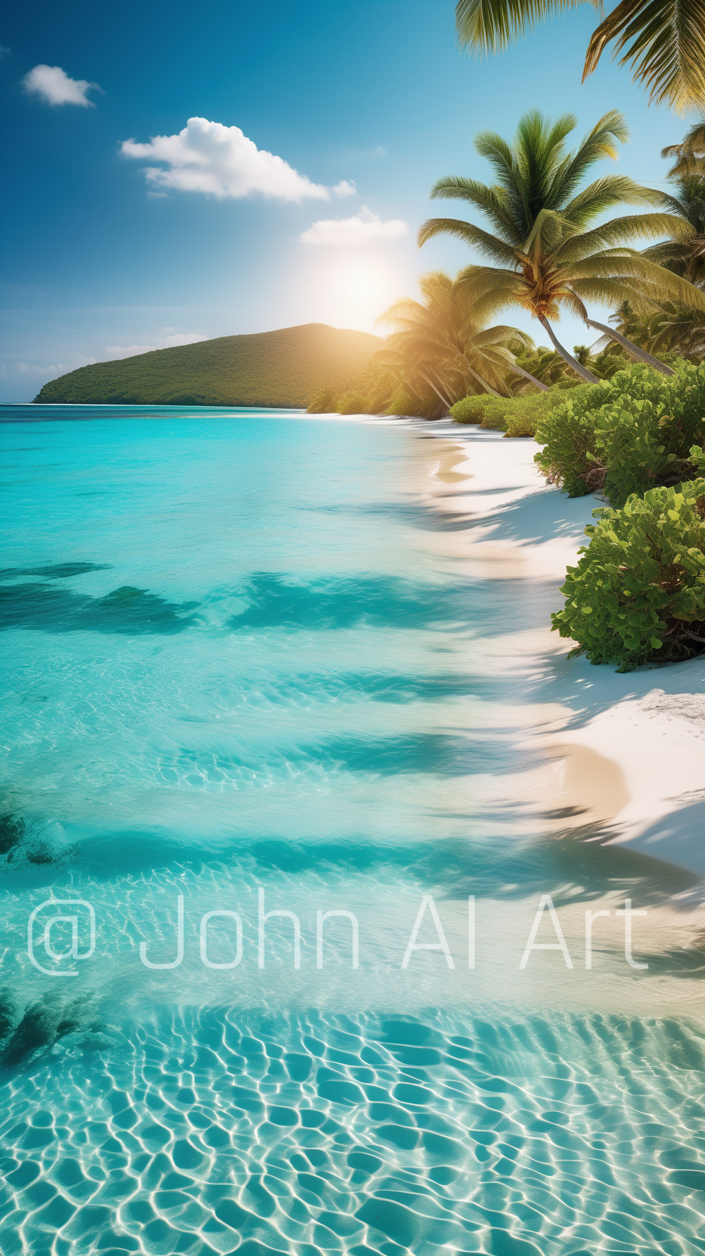Tropical beach with white sand and crystal-clear turquoise water, gentle waves, small warm sun casting soft light, ultra-realistic reflections, cinematic high-resolution wallpaper for smartphone, 1024x1824 px, 9:16. -